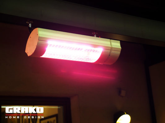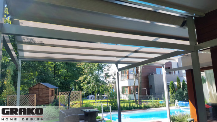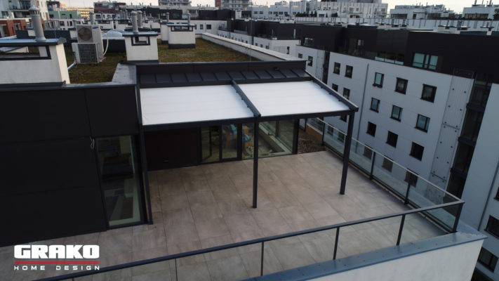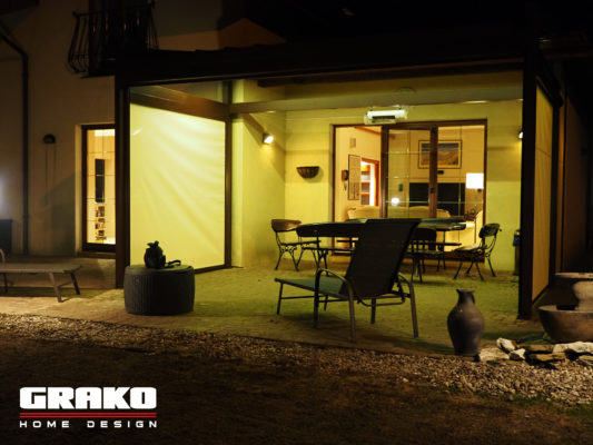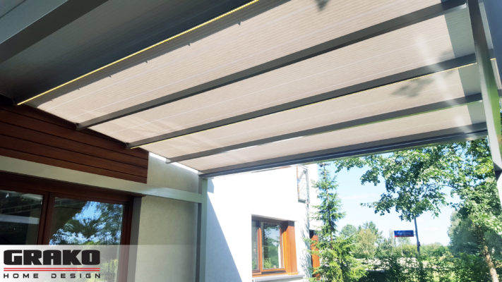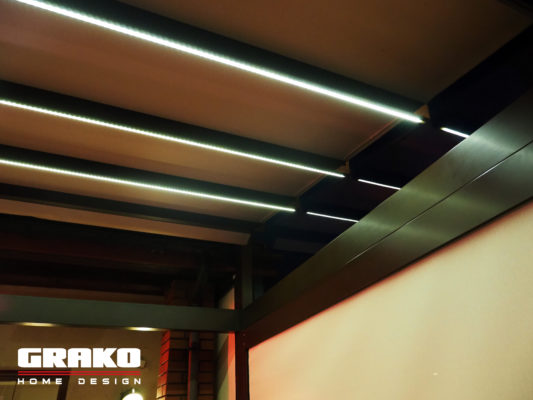 - Oświetlenie LED – wbudowane w konstrukcję pergoli, pozwala korzystać z tarasu po zmroku.